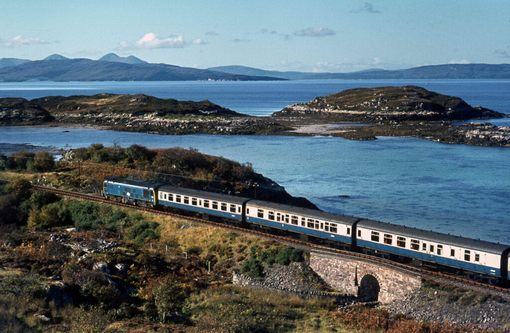 A BR Blue Class 24 heads for Kyle of Lochalsh, skirting Erbusaig Bay on 11th October 1973. A timeless Highland scene from the final years of Class 24s regularly working the line. © David Christie