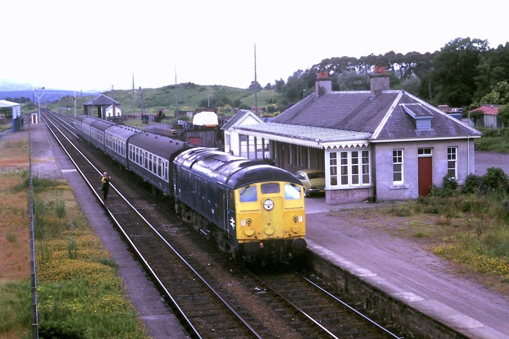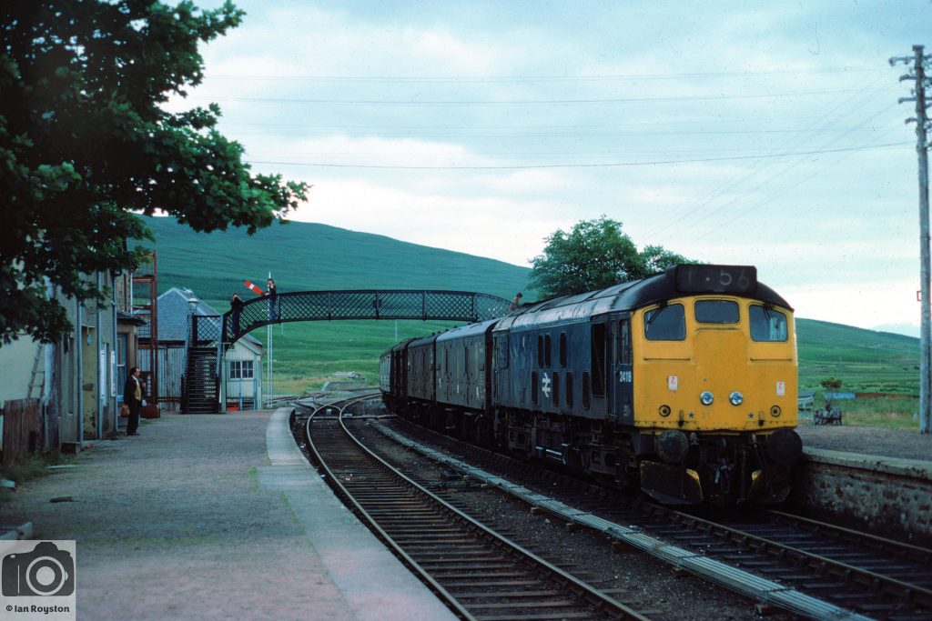 Class 25 No. 24118 heads the early morning Kyle train at Achnasheen on 21 July 1975. Although Classes 26 and 27 are often most associated with Scottish duties, the Class 24s also gave solid service, including work connected with Kyle and Mallaig traffic, where vans often conveyed fish boxes, much to the guards’ displeasure. © Ian Royston