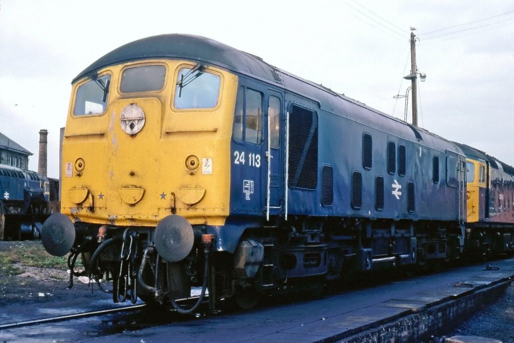 The Class 24/1 subclass covered locomotives D5050–D5150, later numbered 24050–24150, and represented a progressive refinement of the original design. Built between 1959 and 1961 at Derby, Crewe and Darlington, these locomotives incorporated a series of detail changes informed by early operational experience. Their most significant difference was a reduced operational weight of 71–73 tonnes, improving their suitability for lightly laid routes while retaining Route Availability 6. External features evolved during production rather than changing uniformly across the subclass, and headcode boxes were introduced only on the later-built locomotives, beginning with the Scottish Inverness batch from D5114. Locomotives intended for Scottish service were also built with a recess on the driver’s cab side to allow for the later fitting of tablet-catching equipment, reflecting their anticipated use on single-line routes worked by the electric train token system.