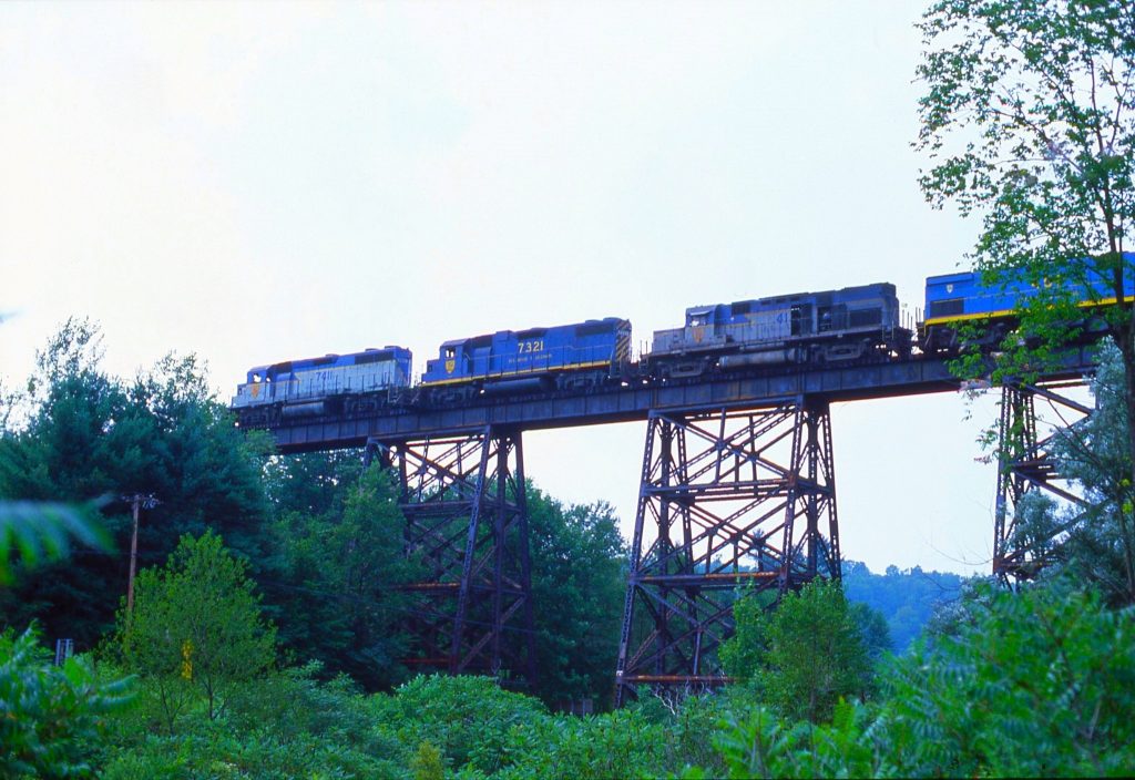 Delaware & Hudson GP39-2 No. 7411, GP38-2 No. 7321, C-420 No. 412 and C424m No. 451 cross the trestle at Harpursville, New York, August 1984. The varied lash-up reflects the D&H’s mixed Alco and EMD power during the period. © Barry Trogu