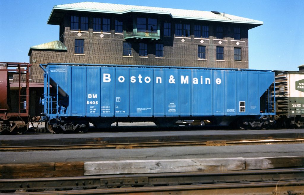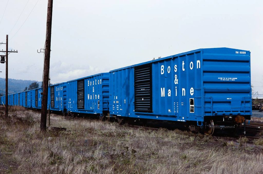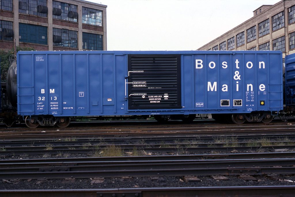 | BM 80000-80024 | 50′ Boxcar | Built Oct 1979 by FMC, Portland, Oregon (builder’s spec R-9120-78; ICC Recordation 10956). 50 ft 6 in inside length, 9 ft 6 in inside width, 10 ft 11 in inside height; 10 ft × 10 ft 5 in side door opening. Outside length 59 ft 1 in; extreme width 10 ft 7 in; height to eaves 14 ft 9 in; extreme height 15 ft 4 in. AAR mech. class XP (newsprint service; “not for general use”), Plate C; Keystone/“Shock Control” 20-in travel cushion underframe (Keystone sliding centersill noted); nominal 100-ton cars, 5,272 cu ft as-delivered (later ORER shows 5,235 cu ft); 188,000 lb nominal (later 185,000 lb; GRL 263,000 shown by 07/2000 on stragglers). Construction features include peaked roof, 12-rib sides, Youngstown 10 ft sliding door, blue-painted fishbelly/side sill with the rest of the underframe black, and jacking pads under the sill. Delivered in blue sides/ends, galvanised (silver) roof, black door; “Boston & Maine” stacked in three lines at the right. Entered the ORER 01/1980 as 25 cars (BM 80000–80024) “Box, Steel, Cushion Underframe, Designed for special loading (Newsprint Service), 50K, Plate C”; description restated 01/1983 with “20″ Travel Shock Control.” Count steady through the 1980s (minor attrition to 21 by 07/1995); sporadic survivors listed into 2000 (one to two cars) before disappearing 10/2000. Security filings reaffirm XP-A402 classification (17114, 12/10/1990). |