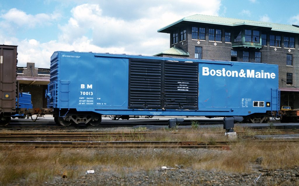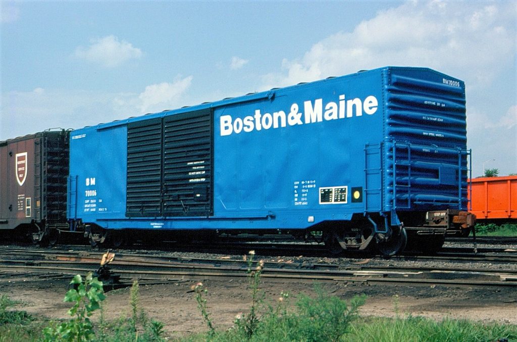 | BM 70000-70049 | 50′ Boxcar | Built Oct 1966 by American Car & Foundry for D&RGW 63300–63499 (ACF Precision Design with pressed panels beside the doors); leased into B&M service as 70000–70049 in 1979 via Itel/MLL (ICC Recordations 10169, 10191). 50 ft 6 in inside length, 9 ft 4 in inside width, 10 ft 6 in inside height; offset double sliding Youngstown doors with 15 ft × 9 ft 10 in opening. Outside length 58 ft 1 in; extreme width 10 ft 7 in; height to eaves 14 ft 3 in; extreme height 14 ft 11 in. AAR mechanical class XM in early listings, later shown as XP for auto parts in the ORER. Plate B clearance. Keystone 20 in travel cushion underframe with Cardwell-Westinghouse draft gear; ABD brakes; ASF A-3 Ride Control trucks with 33 in wheels; Stucki single-roller side bearings; nailable steel floor (ECR-3). Construction features include diagonal-panel roof by Standard Railway Equipment Co., two-piece SRE ends (dreadnaught 4-3-1 “banana” profile), short ladders, and ACF PD side construction. Marked capacity 145,000 lb; light weight about 64,200 lb; 4,941–4,947 cu ft. Delivered to B&M in blue with grey or galvanised roof and black doors, “Boston&Maine” as a single word on the right side; COTS and U-1 dot applied; required stencil noting title subject to ICC filings. Entered the ORER 10/1979 as 50 cars “Box, Steel, Cushion Underframe, Nailable Steel Floor, 50K,” re-described 01/1983 as “20 in travel Shock Control cushion underframe, offset double doors (auto parts).” Minor attrition to 48 cars by 10/1984 and 47 by 01/1989; last shown 10/1990 and not listed 01/1991. |