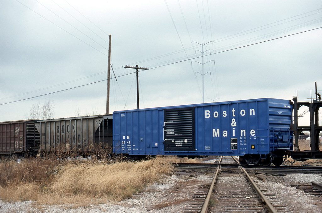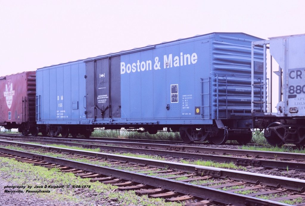 | B&M 100-149 | 50′ Boxcar, Insulated | Boston & Maine 100–149 series cars were 50 Evans-built 5,100 cu ft insulated boxcars (class RBL), constructed in late 1969 by U.S. Railway Equipment Co. at Blue Island, Illinois, and acquired by the B&M in 1970. Although rostered to the railroad, they were part of a leased fleet (USLX), reflecting the growing use of high-capacity, specialised cars for temperature-sensitive and palletised traffic. Equipped with Dual Air Pak loaders, Hydra-Cushion underframes, and double 8 ft plug doors, the cars were designed for modern handling methods, including forklift loading with onboard pallets. ORER records show them consistently classified as insulated or refrigerator cars through the 1970s and 1980s, with only minor descriptive changes such as the addition of bulkheads and Plate C clearance notation. The fleet began to disperse relatively early. A significant portion (35 cars) was returned by 1975, with many subsequently renumbered into USLX service or transferred to other operators, including Grand Trunk Western and industrial users such as Wickes Agricultural and M.I. Drilling Fluids. The remaining cars continued in B&M service into the early 1990s, though by 1993 the series had disappeared from the ORER. Finished in a distinctive blue livery with Dual Air Pak and Cushion-Pak branding, these cars were commonly associated with paper and forest products traffic in New England, sometimes noted in “Budweiser” or beer-related service. They represent a transitional generation of high-cube, specialised boxcars that bridged traditional insulated cars and later fully mechanised freight equipment. |